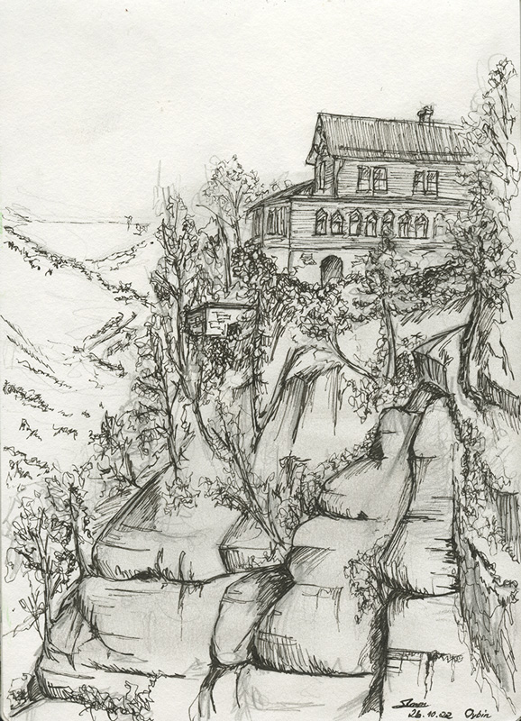 Eine schnelle Finelinerskizze mit lockerem Strich eines Hauses am Berg.